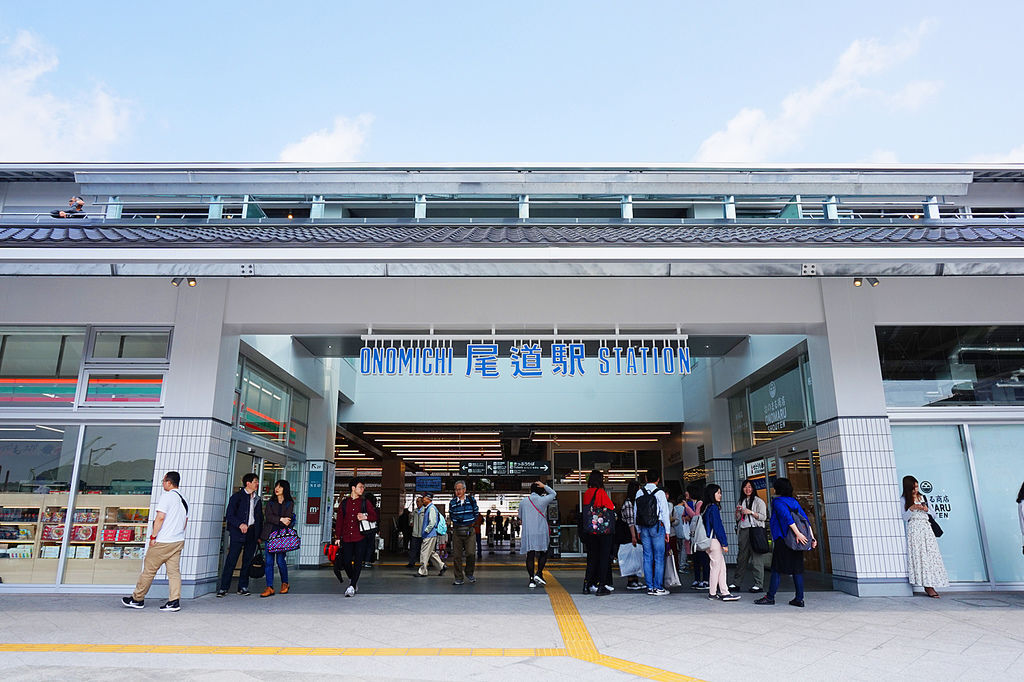 照片是今年2019年3月落成的尾道車站新站房,以藍白為主的現代設計非常融入風景,新建築的磁磚和玻璃窗都在陽光下閃閃發亮。