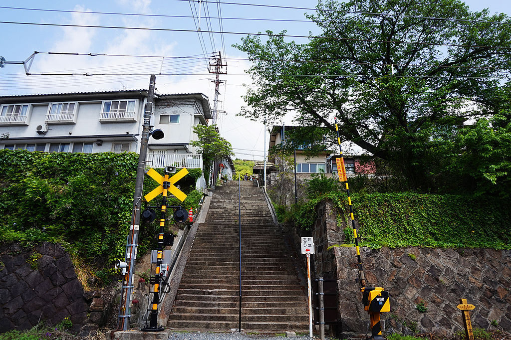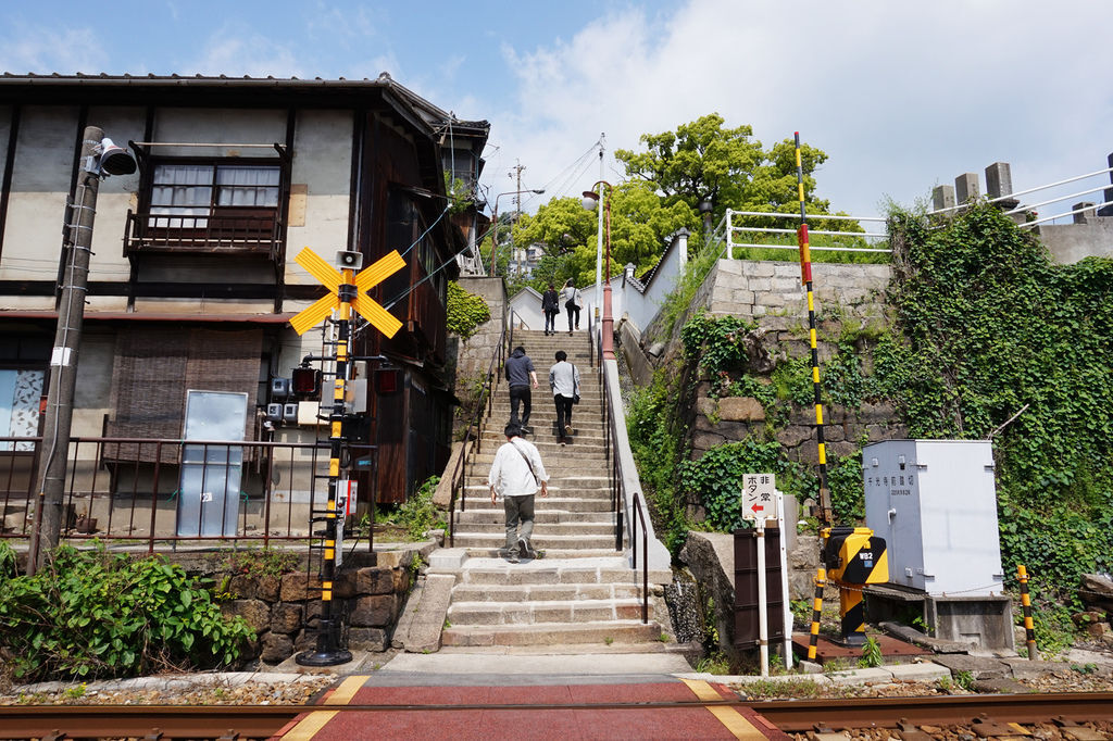 沿著軌道走會看到許多可以爬上小山坡的階梯,確認Google地圖似乎靠近「貓之細道」了,我們就決定從這條路線上去。
